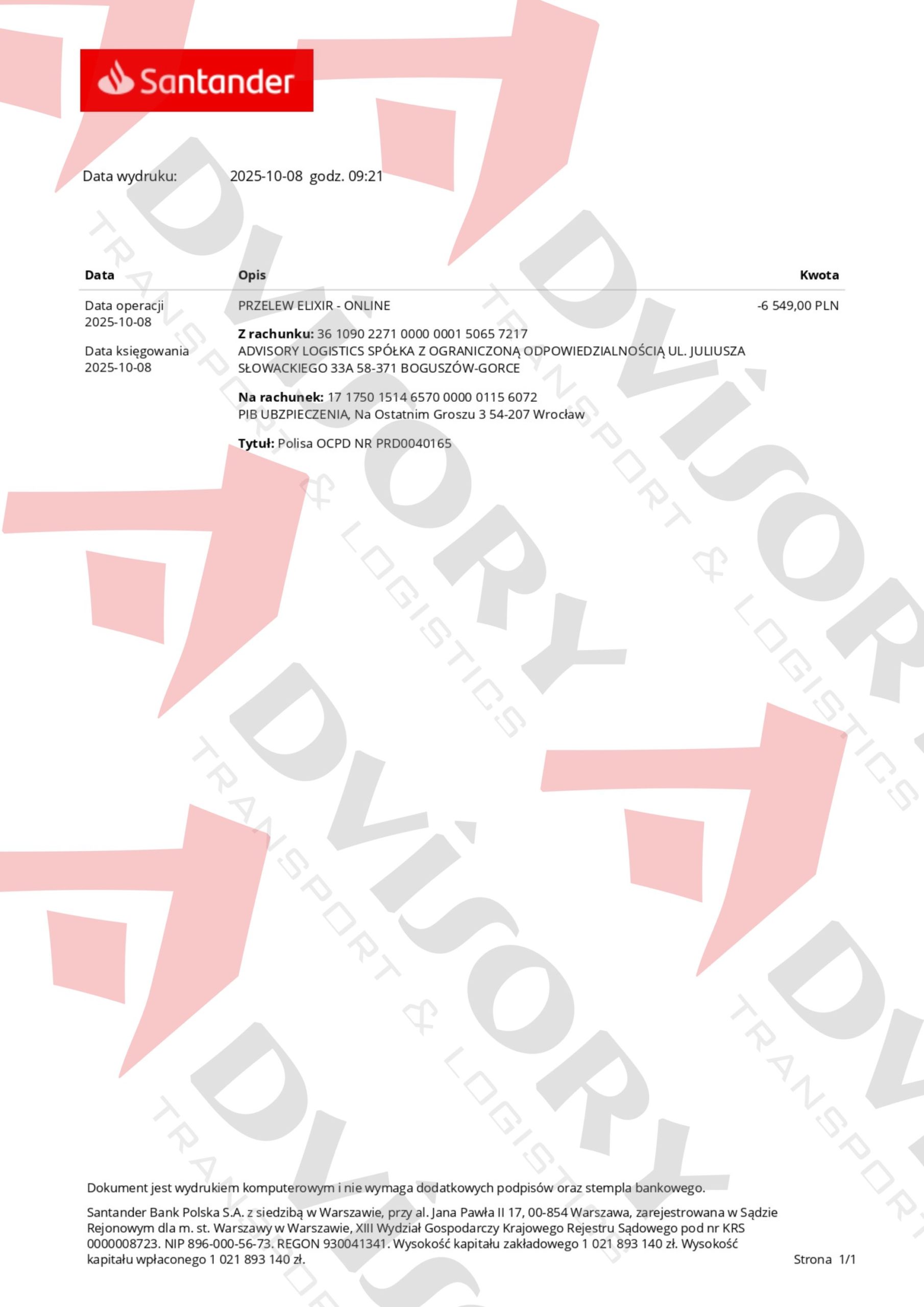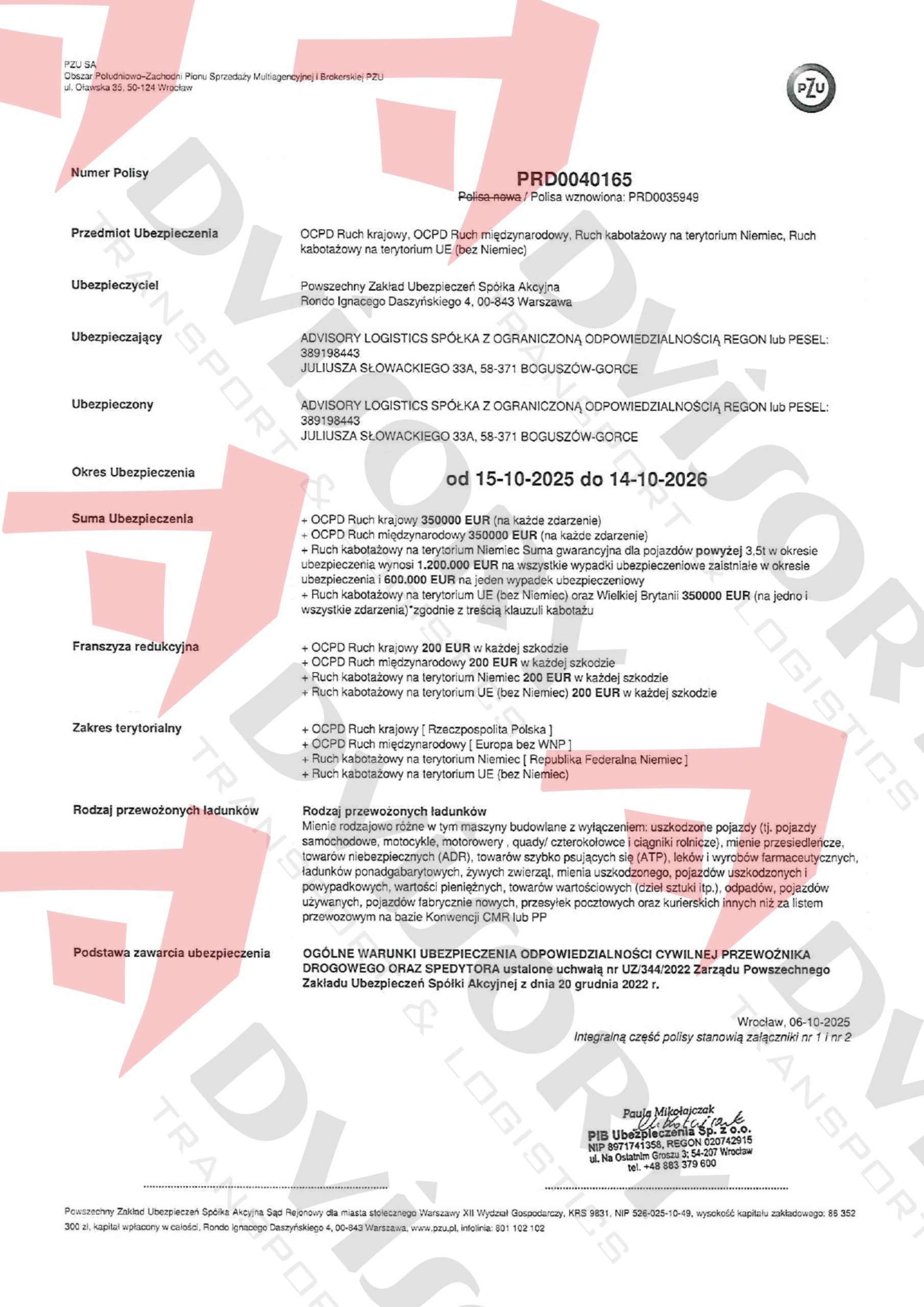 Do pobrania Kliknij w plik, aby pobrać dokument ADVISORY LOGISTICS Sp. z o.o. Ze względów bezpieczeństwa wszystkie dokumenty oznaczone są firmowym znakiem wodnym. Licencja transportowa międzynarodowa Ubezpieczenie OCP -14.10.2025 Dowód opłaty składki OCP - 14.10.2025 Ubezpieczenie OCP - 14.10.2026 Dowód opłaty składki OCP - 14.10.2026
